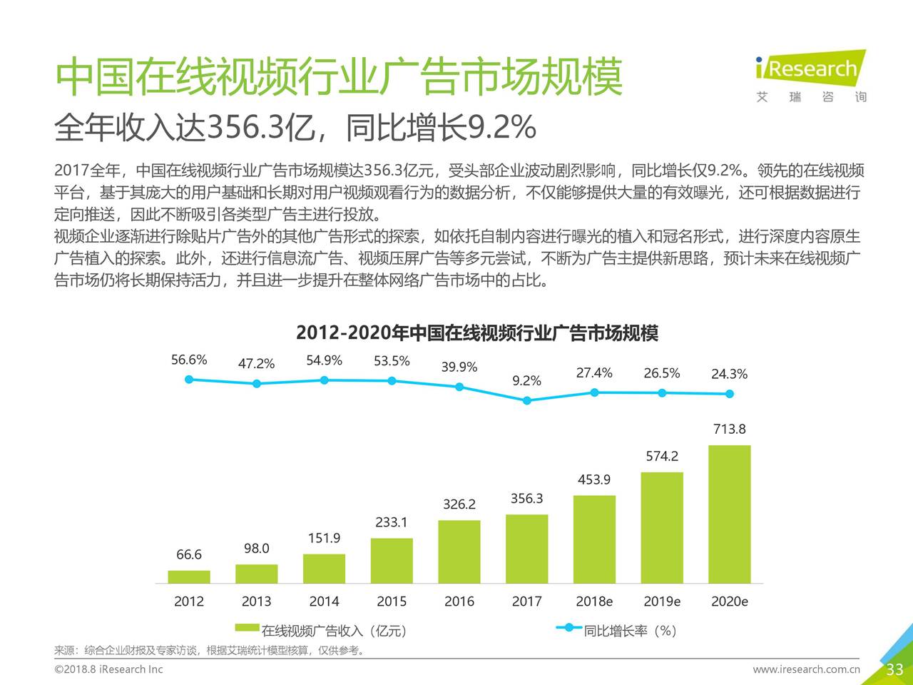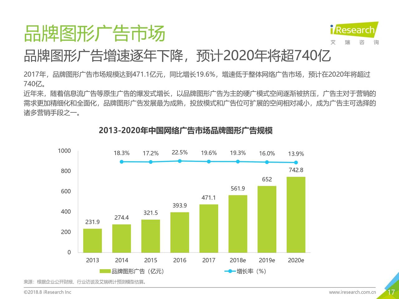 2017年度中国网络广告市场规模达到3750.1亿元,同比增长32.9%,未来两年市场规模仍保持较高水平,但增速将略缓,至2020年整体规模有望超过万亿元。